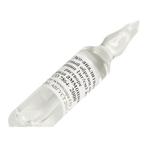 ГСО 7864-2000 массовой концентрации азота в растворе хлорида аммония предназначен для градуировки фотоэлектроколориметров, спектрофотометров, атомно-абсорбционных полярографов и спектрометров, аттестации методик измерений в объектах окружающей среды, сточной и питьевой воде, воздухе рабочей зоны, контроля погрешности методик измерений методами спектрофотометрии, атомно-абсорбционной спектрометрии и полярографии. Представляет собой водный раствор аммония хлористого. Материал расфасован в стеклянные ампулы.