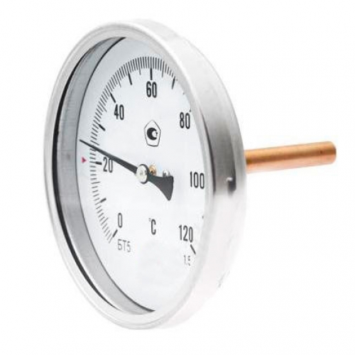ермометр биметаллический БТ-51.211 служит для измерения температуры жидкостей, пара, газа в системах отопления, теплоснабжения, кондиционирования и вентиляции. Принцип действия термометров БТ-51 основан на зависимости деформации биметаллической пружины от измеряемой температуры. При изменении температуры, пружина деформируется и вращает стрелку прибора.